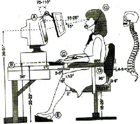 Doğru oturuş Bilgisayarın karşısında otururken şunlara özen göstermeliyiz. · Masa yüksekliği 65-70 cm. · Yüksekliği ayarlanabilir, sırtı bele uygun ve esnek bir ergonomik koltuk · Omuzlar rahat bırakılmış · Dik oturulmuş ve sırt desteklenmiş · Kollar yatay veya biraz yukarıda · Dirsek ve eller düz bir çizgide · Bacakların üst kısmı yatay · Dizler 9 veya 110 derece açıda olmalı Gözlerimizin sağlığı için: · Bilgisayar kullanmadan önce bir göz muayenesinden geçmeli, görme bozukluğu varsa mutlaka düzeltilmeli · Ekrandan 45-75 cm. uzakta oturmalı · Ekranın üst kenarı ile göz hizasının aynı seviyede olmasına dikkat etmeli · Kağıt tutucu kullanıyorsak bunu ekranla aynı hizada tutmalı · Odanın loş ışıklı, aydınlatma 30-50 mumluk ve indirekt olmalı · Işık ekrana dik açıyla gelmemeli · Işık yansıma ve parlamaları önlemeli · 15-20 dakikada bir kısa süre gözleri uzağa odaklayarak göz kaslarının dinlenmesi sağlanmalı. Bunların yanı sıra: · Saat başı mola vererek odayı temiz hava ile doldurmak ve ufak ekzersizler yapmak · Hamilelerin ekran başına geçmemelerini sağlamak gerekiyor. |